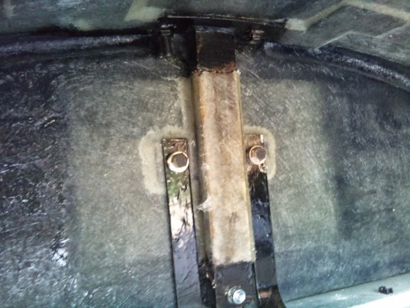 From inside the boot, the supports can be seen with the bonded metal plates. I've added the additional vertical supports either side of the main support bar and bolted them to the chassis. I've taken photos at every stage to show Mr. IVA that the seat belts are bonded to the metal (and not the fibreglass body), and these in turn are attached to the chasssis. Safe? I think so! From above: